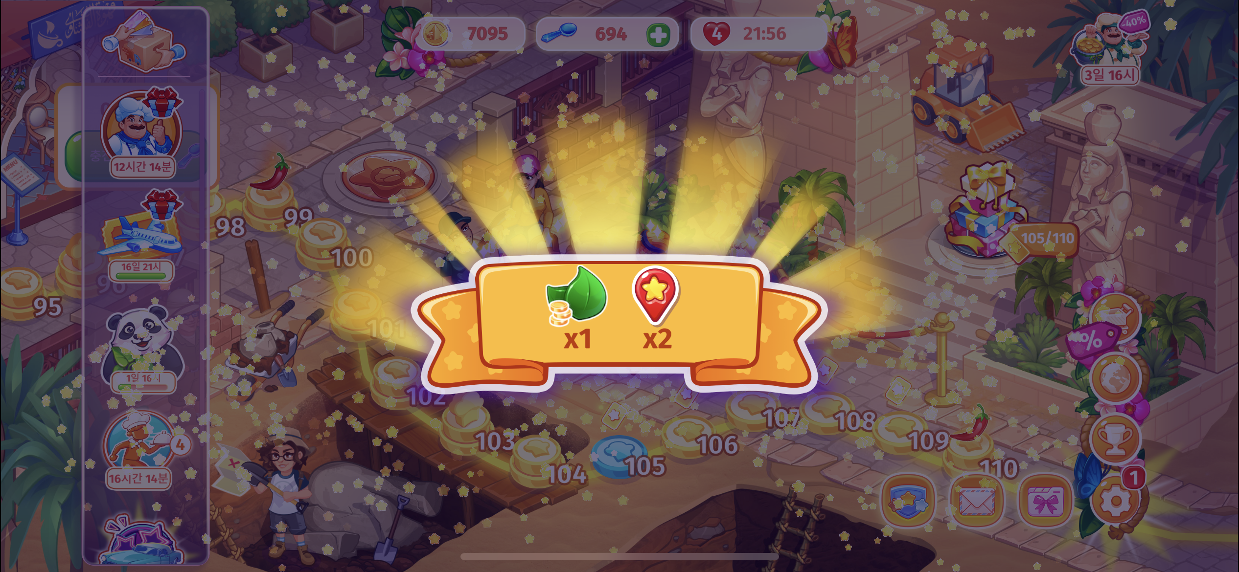 각 레벨을 클리어 하면 돈과 스푼, 다른 도시로 가는 티켓을 받습니다.