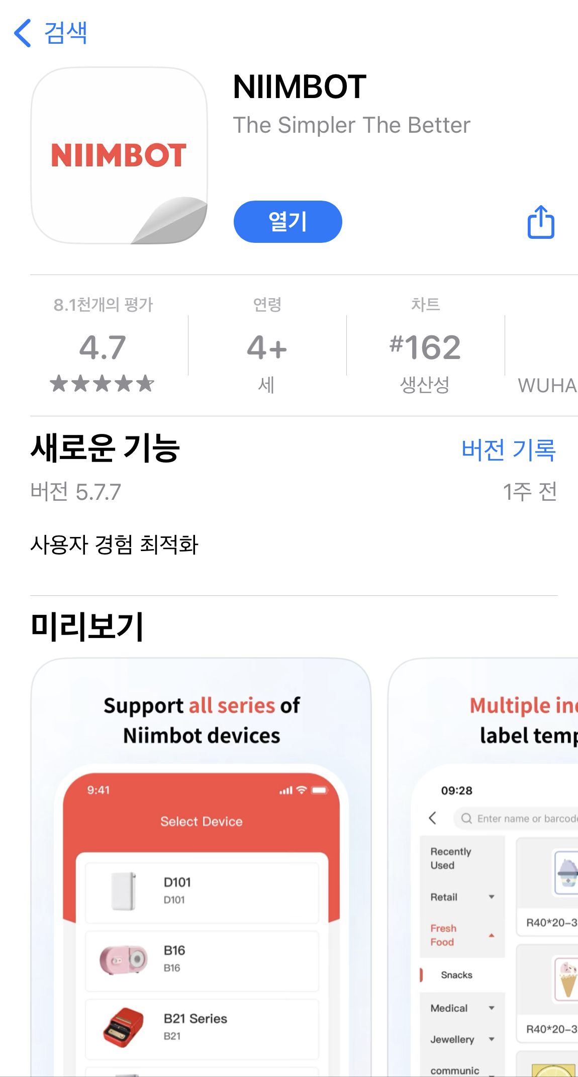앱스토어, 구글플레이 스토어에서 niimbot을 검색하여 앱을 다운로드합니다.