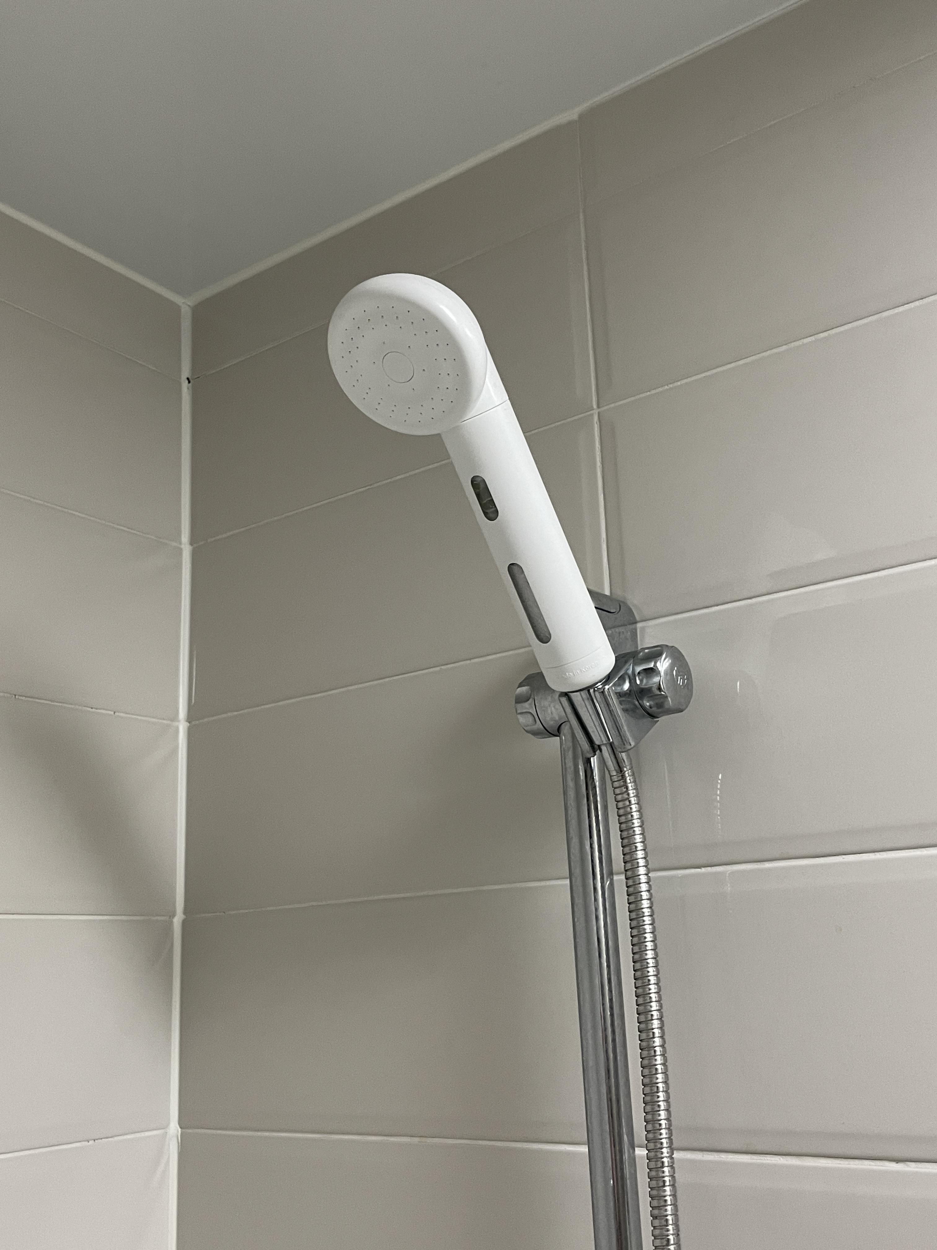샤워기 헤드를 걸어둔 모습입니다. 동글동글하고 하얀 디자인이 화장실의 분위기를 밝게 해 줍니다.