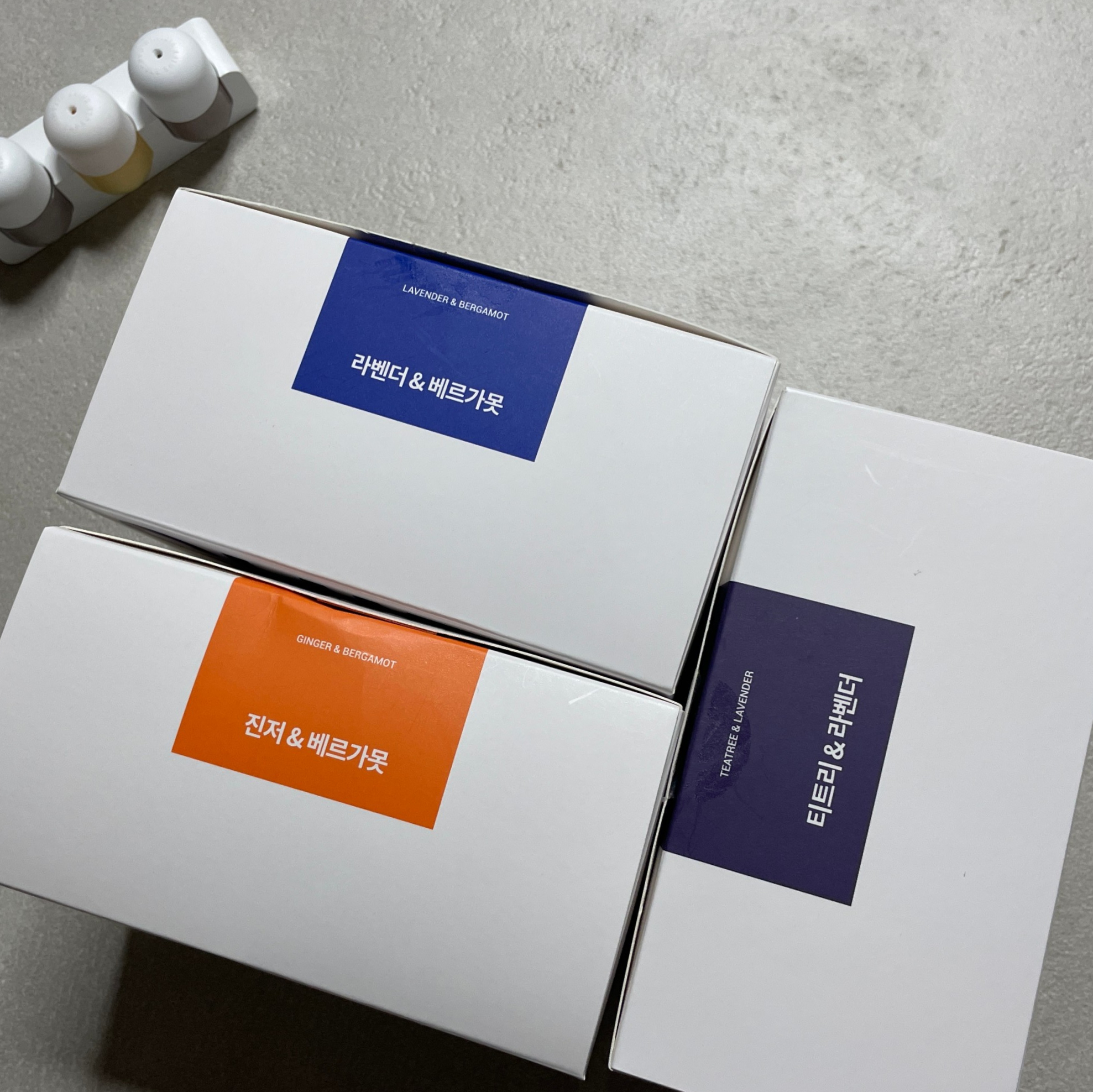 제가 구매한 향은 진저 앤 베르가못, 라벤더 앤 베르가못, 티트리 앤 라벤더입니다. 베르가못, 라벤더, 티트리향은 스트레스와 불안을 없애주는 향으로 알려져 있습니다. 아침에는 간단히 샤워하고 저녁에 꼼꼼히 샤워하는 만큼 일과 중 스트레스를 없애주는데 제격입니다.