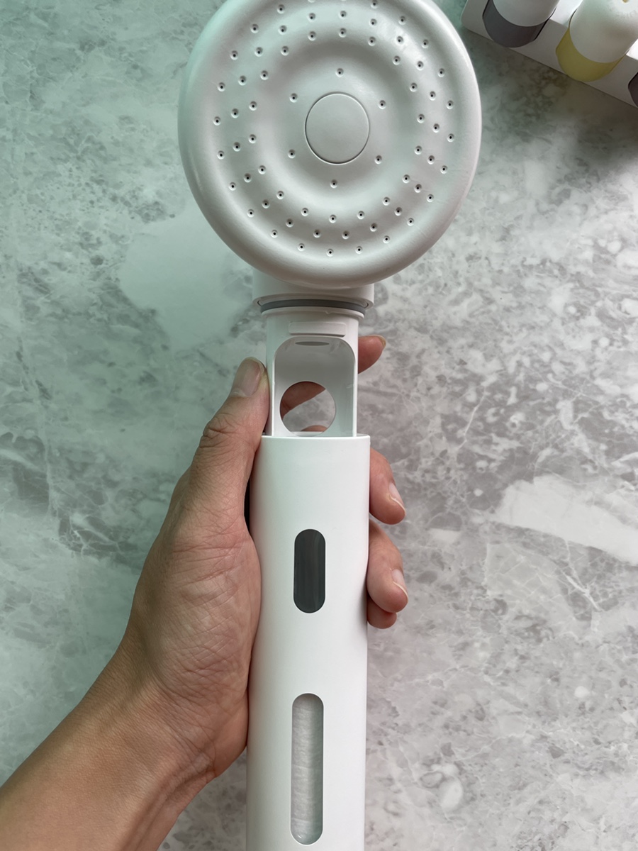 먼저 샤워기 헤드 입니다. 동글동글 통통하게 생겼습니다. 색상은 화이트색만 있습니다. 통통해서 그립감이 좋고 머리 아랫부분에 아로마테라피 캡슐과 필터를 끼우는 공간이 있습니다.