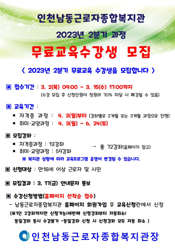 남동근로자복지회관에서 매분기마다 자기계발 및 직업훈련 등을 위한 강의를 개설하고 있습니다.