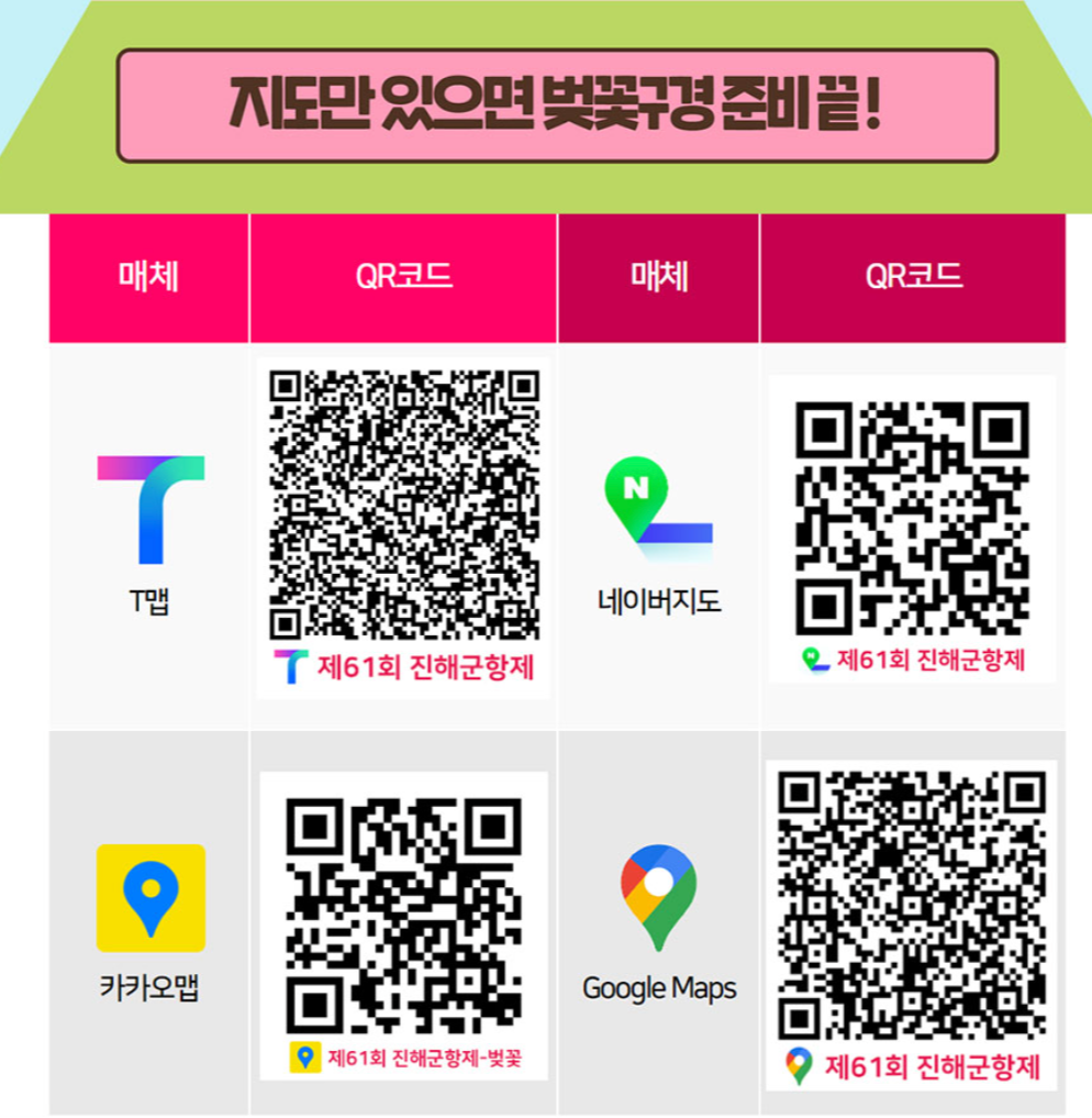 진해 군항제의 공식 홈페이지에서는 네이버지도, 티맵, 카카오지도, 구글지도로 벚꽃의 명소를 저장해 놓았습니다. 큐알코드로 스캔하면 사용하는 내비게이션앱으로 들어가 가고 싶은 명소를 터치하면 바로 내비게이션으로 연결하니 편하게 사용할 수 있습니다.